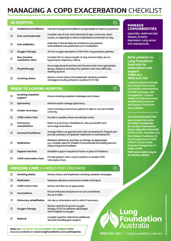 This Checklist was developed by the LFA to assist HCP’s with managing a COPD Exacerbation supported by the use of Stepwise Management of Stable COPD.