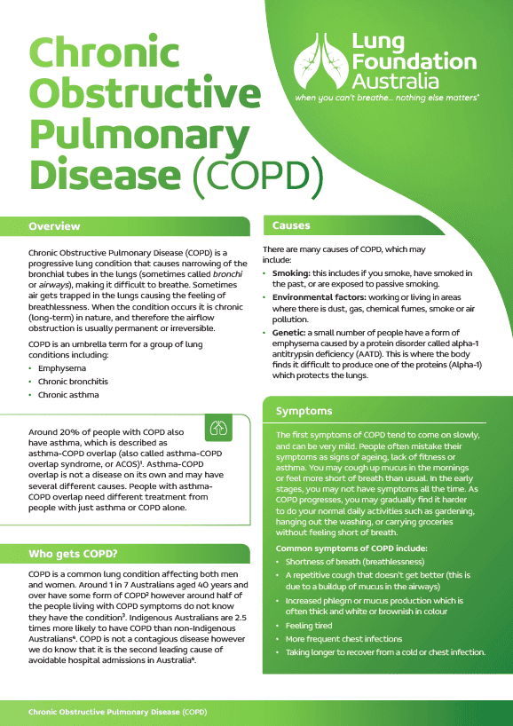 This Factsheet developed by the LFA provides an overview on COPD, the symptoms, diagnosis, treatment and management which can be a useful tool to assist your COPD patients.